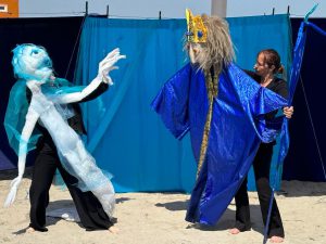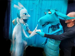 De nieuwe voorstelling Sterren van de zee is een spannend onderwatersprookje met grote poppen en muziek over de verboden liefde tussen een zeemeermin en een zeepaard en over een vuurdraak die de zee bedreigt.