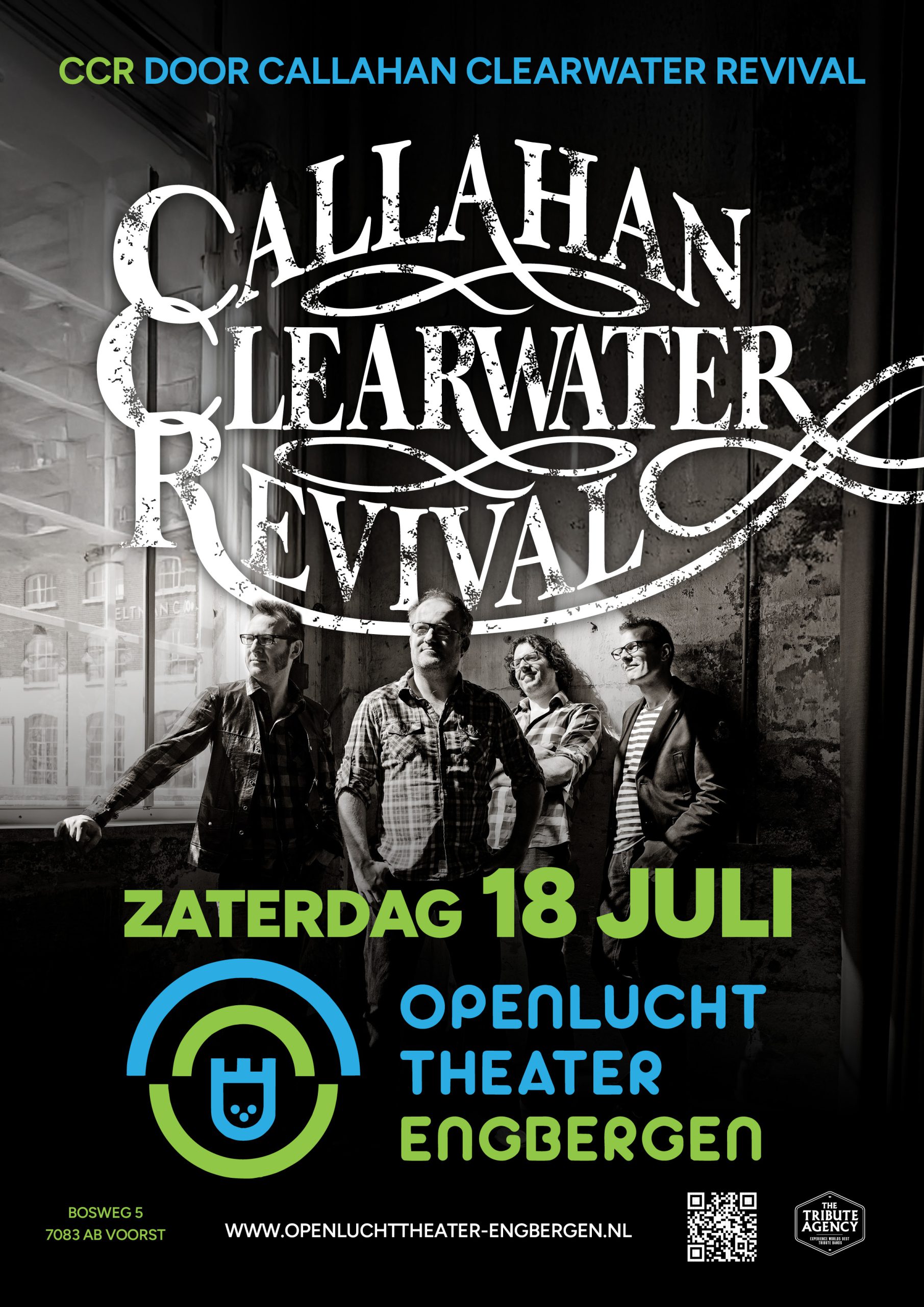 Met Callahan Clearwater Revival ga je terug naar de tijd van de onvervalste Roots en Swap Rock. Klassiekers als Fortunate Son, Suzie Q, Born On The Bayou, Bad Moon Rising, Hey Tonight en Down On The Corner maken allemaal onderdeel uit van de eindeloos lange lijst met hits van Creedence Clearwater Revival. Wanneer je je ogen sluit dan hoor je de vroegere John Fogerty en CCR. Mede hierdoor is de band in 2015 overall winnaar geworden van the Battle Of The Tribute Bands. De muziek wordt vanuit de basis overgebracht door de vier Achterhoekse muzikanten van Callahan Clearwater Revival.